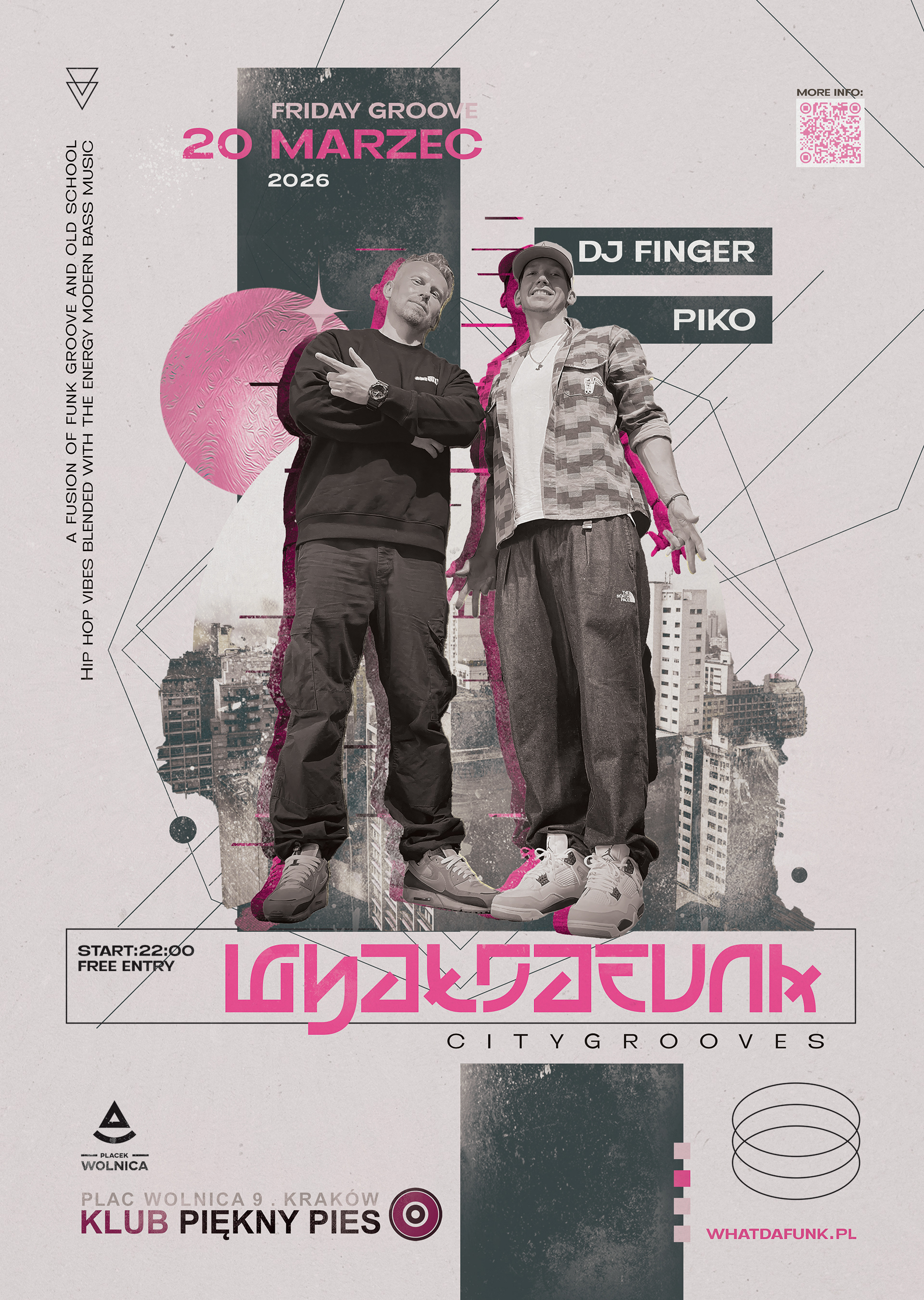 „City Grooves” to coś więcej niż impreza — to chwila zatrzymania w czasie. Spotkanie z kulturą, w której rytm łączy ludzi, a parkiet staje się wspólną przestrzenią swobody, energii i improwizacji. Od korzeni funku i soulu, przez narodziny hip-hopu, po jazzowe i elektroniczne echa lat 90. — z gramofonów, z historią i z miejskim klimatem, który tej nocy zabrzmi na krakowskim Kazimierzu.